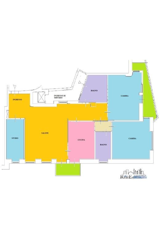 doppi ingressi, ingresso, salone, cucina abitabile, 2 camere matrimoniali, studio, 2 bagni (uno con vasca e finestra ed uno con box doccia), 2 balconi. Completano la proprietà un comodo box auto di 15mq ed una cantina di 8mq.